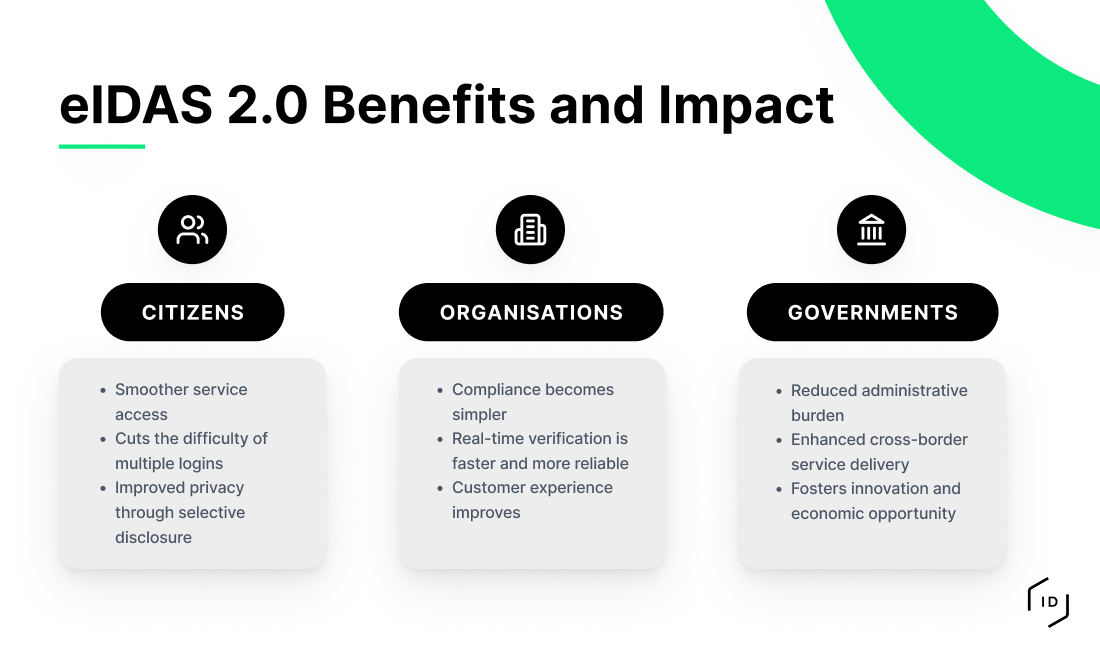 For organisations, eIDAS 2.0 can reduce identity verification costs and improve security. Real-time verification of signed credentials is faster and more reliable than document collection and manual review. Because credentials are cryptographically signed by trusted issuers, the risk of fraud decreases significantly.